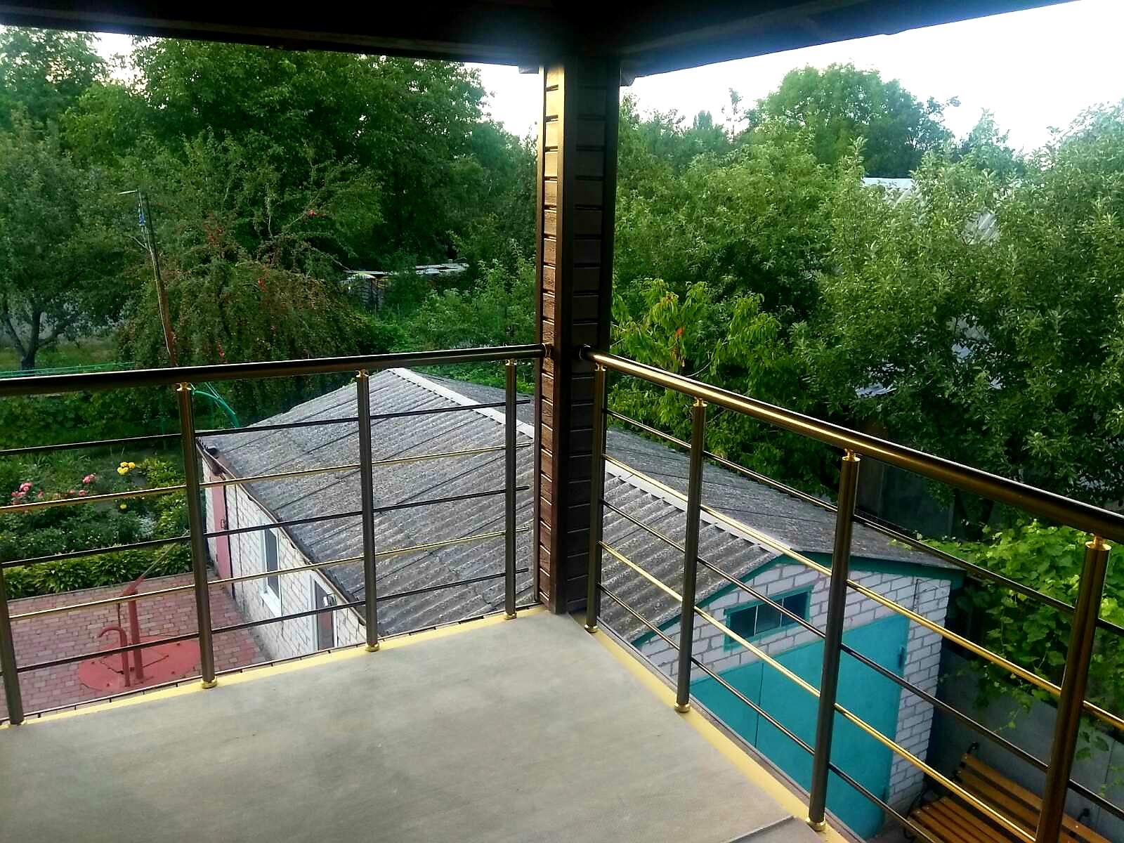 Бронзовые алюминиевые перила очень хорошо сочетаюся с темными столбами