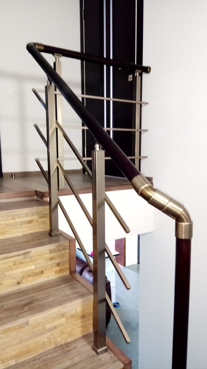 Квадратные перила с круглым деревянным поручнем любого цвета - очень хорошее решение для жилого строительства