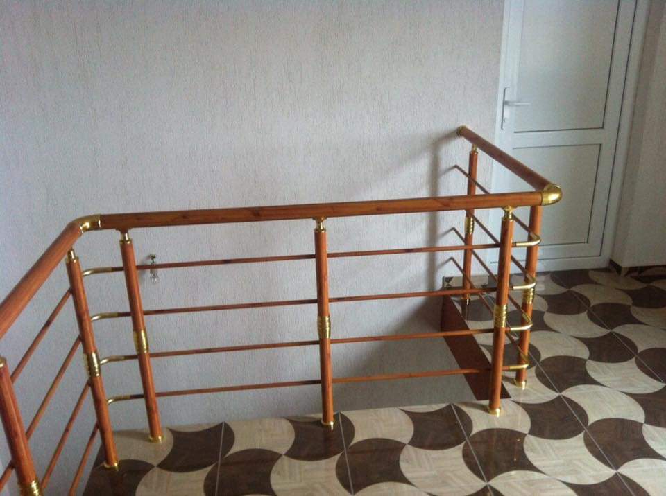 ПЕРИЛА АЛЮМИНИЕВЫЕ НА ЛЕСТНИЦУ КРУГЛЫЙ ПРОФИЛЬ ЦВЕТ ''ПОД ДЕРЕВО'' С ПРУТИКАМИВ алюминиевых перилах цвет под дерево лучше всего сочетаеться с золотой фурнитурой510500