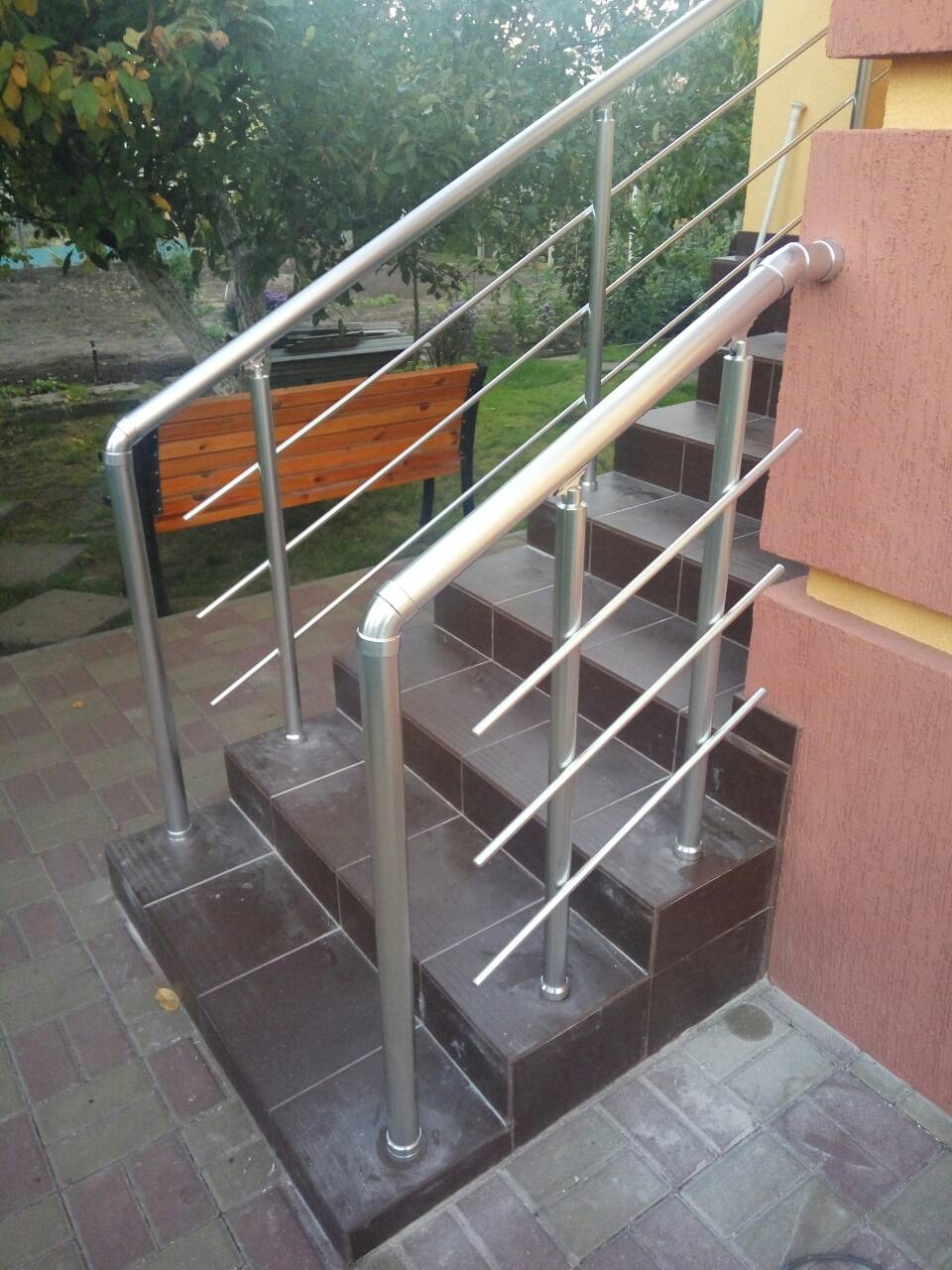 Поручні алюмінієві срібного кольору підходять на будь-яке світле ганок.