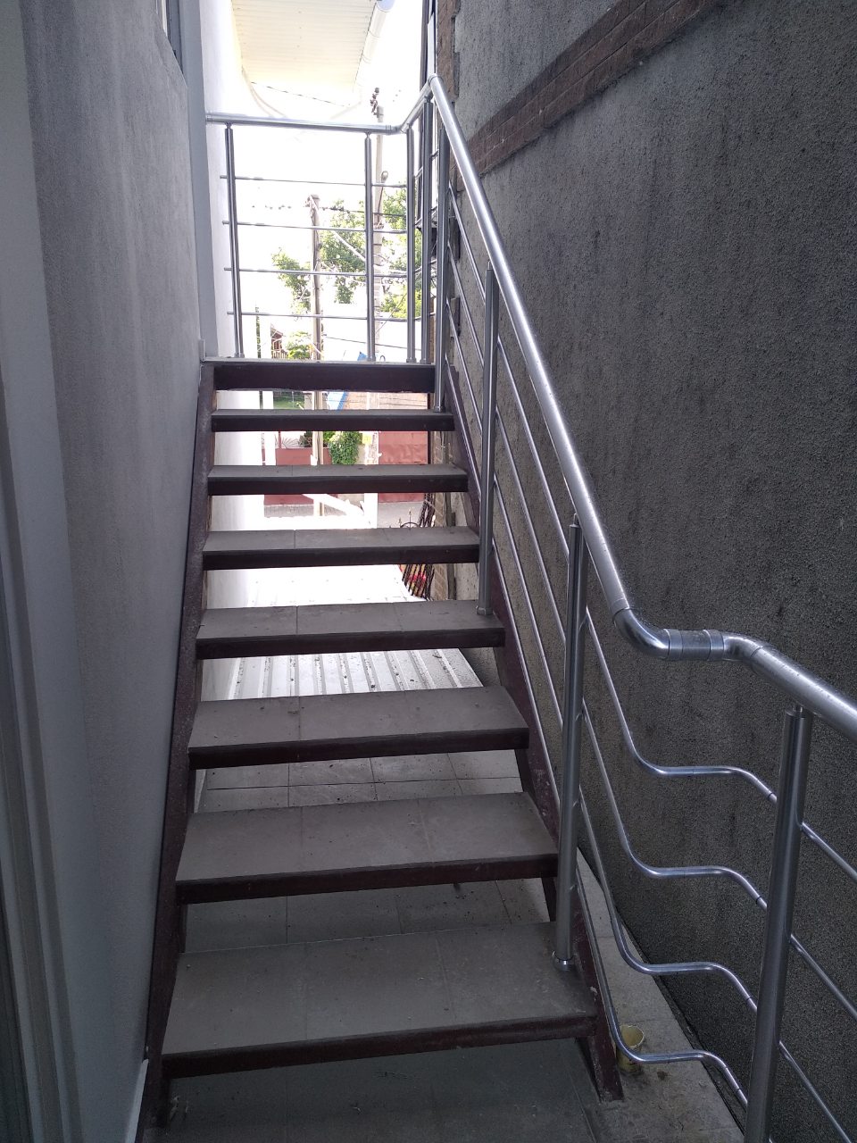 алюмінієві перила у кольорі срібло дуже добре гармонують із сірою плиткою на сходах.