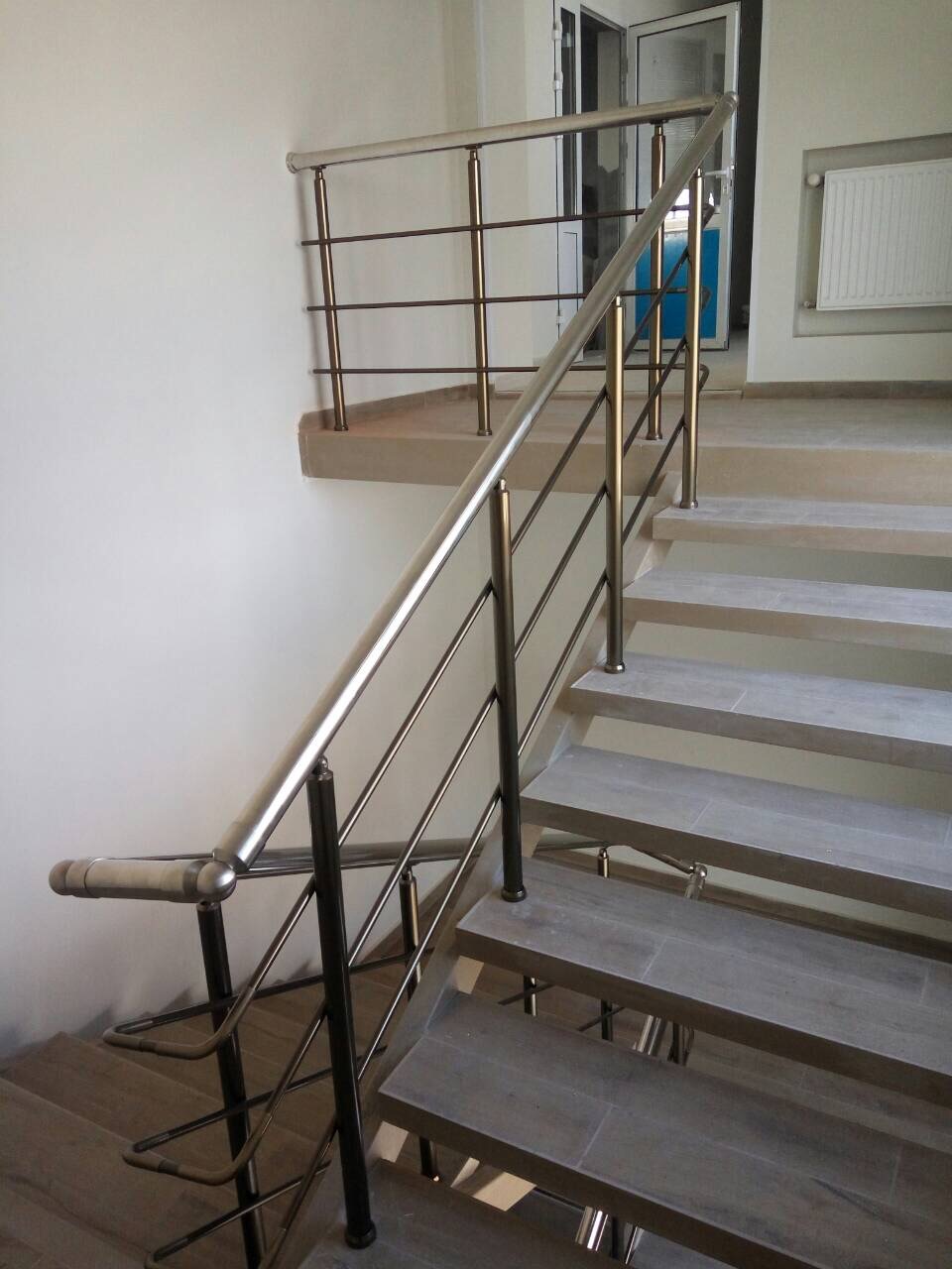 Перила алюминиевые на лестницу круглый профиль цвет шампань с прутикамиВ этот варианте стойки цвета бронза и поручень из нержавеющей стали. Очень оригинальное и интересное сочетание. Еще лучше - можно сделать квадратные алюминиевые стойки с круглым нержавеющим поручнем. Очень оригинально.510500